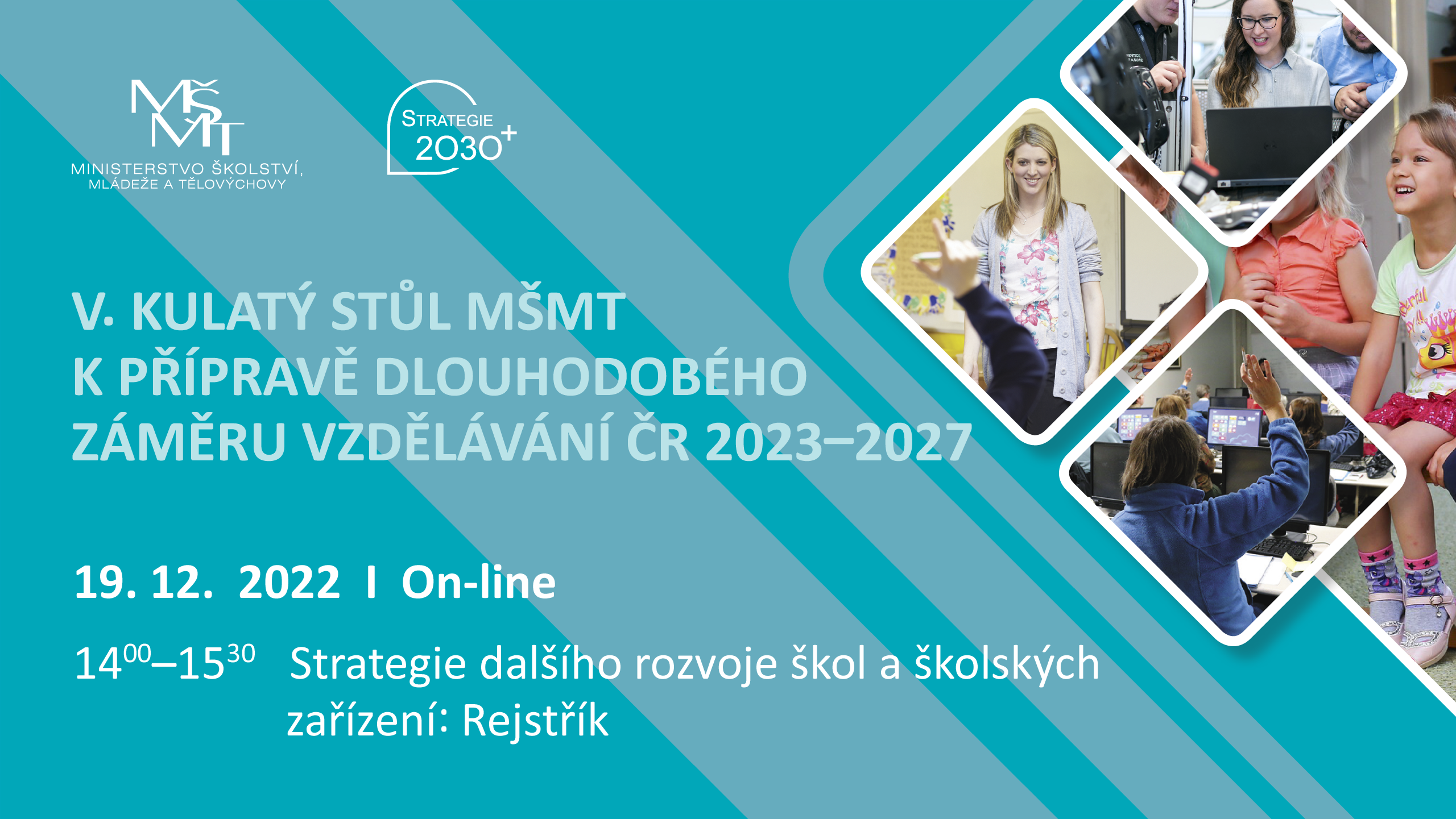 Ministerstvo školství, mládeže a tělovýchovy (MŠMT) Vás zve na pátý kulatý stůl k přípravě Dlouhodobého záměru vzdělávání ČR na období 2023-2027. Jde o on-line setkání, které se uskuteční v pondělí 19. 12. 2022 odpoledne mezi 14:00-15:30, kde budou představeny a spolu s odborníky diskutovány návrhy opatření pro téma: strategie dalšího rozvoje škol a školských zařízení: rejstřík, a to včetně návaznosti na postup a plnění cílů Strategie 2030+.