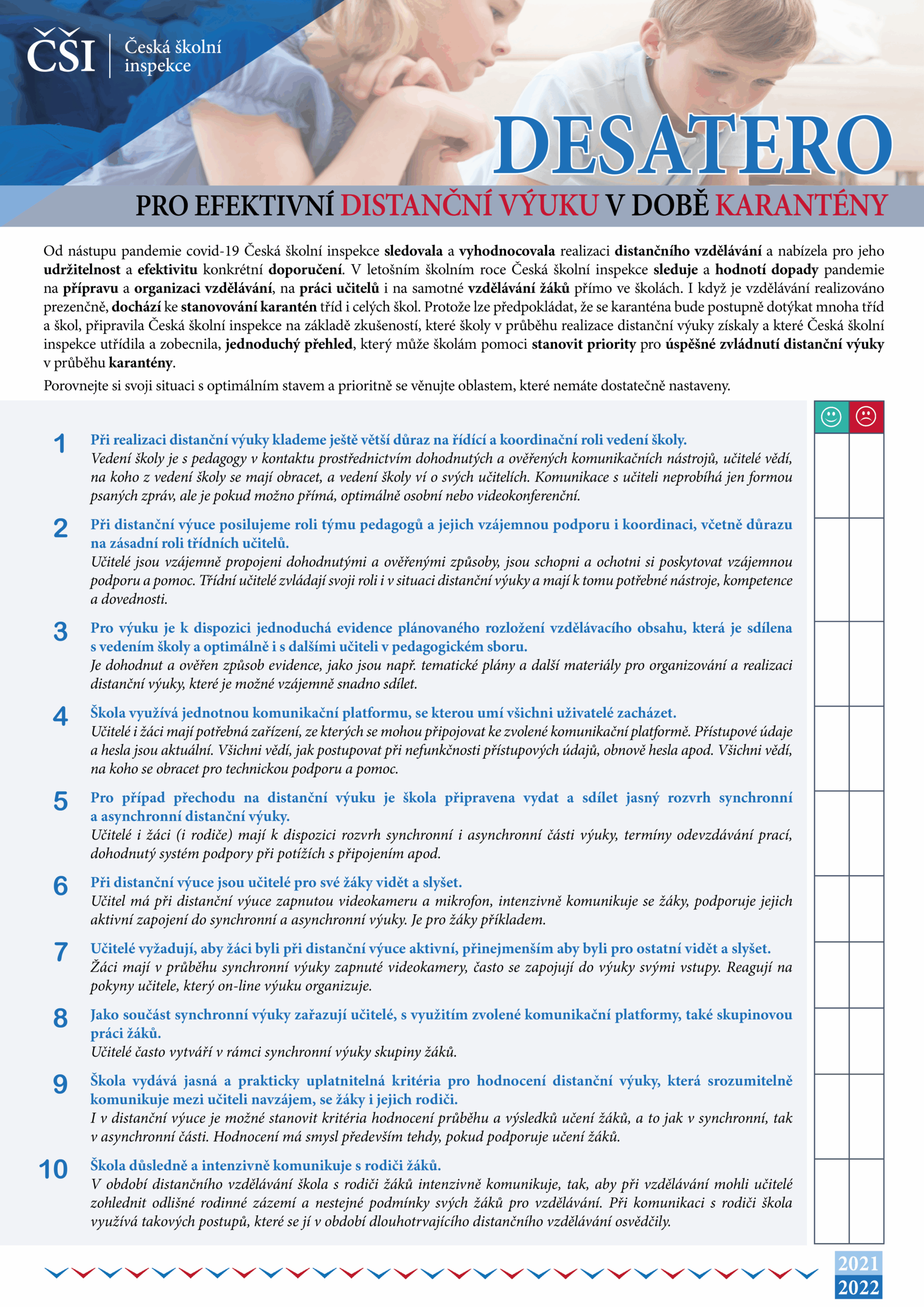 Česká školní inspekce (ČŠI) 4. 11. 2021 vydala Desatero pro efektivní distanční výuku v době karantény, kterou naleznete mezi metodickými materiály webu Edu.cz.