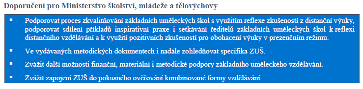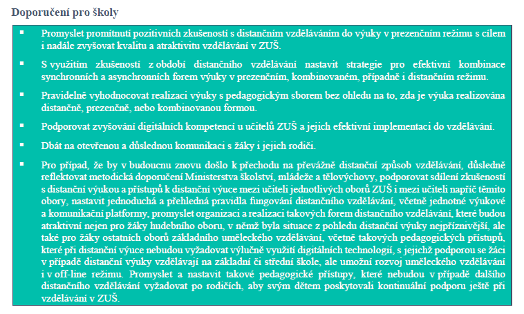 • Vedení škol a pedagogové využili zkušeností získaných na jaře 2020, kdy si distanční výuku zkoušeli a hledali vhodné způsoby náhrady výuky prezenční poté. Tyto zkušenosti vedly k výraznému zkvalitnění distanční výuky na základních uměleckých školách ve školním roce 2020/2021.
