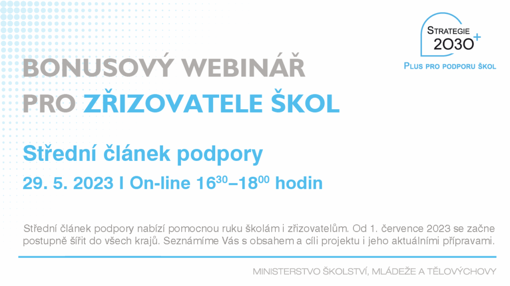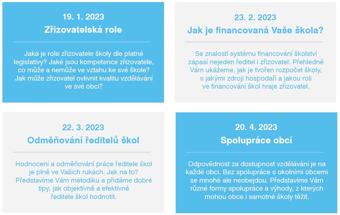 Střední článek MŠMT organizoval cyklus čtyř online webinářů pro zřizovatele, které probíhaly jednou měsíčně od ledna do dubna 2023. Určeny byly jak pro nové starosty, radní a zastupitele, tak pro ty, kteří již mají ve zřizovatelské roli zkušenosti.