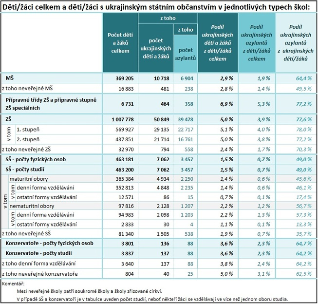 Celkový počet dětí a žáků v mateřských, základních a středních školách a konzervatořích činí ve školním roce 1 850 696. V případě základních škol počet dětí a žáků poprvé v historii České republiky překonal jeden milion, čemuž zde významně napomohlo právě i více než 39 478 ukrajinských uprchlíků. Cizinci s ukrajinským státním občanstvím se rovněž stali nejpočetnější skupinou cizinců v českých školách regionálního školství. Počty dětí a žáků, jakož i ukrajinských uprchlíků v jednotlivých druzích škol prezentuje níže uvedená tabulka.