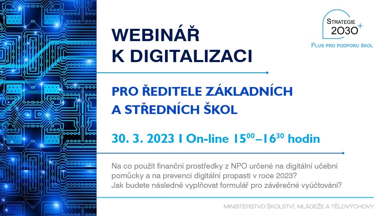 Účastníky seznámíme s tým, na co použít finanční prostředky z NPO určené na digitální učební pomůcky a na prevenci digitální propasti v roce 2023. Zároveň provedeme účastníky webináře otázkami, které je budou čekat v následujícím roce při závěrečném vyúčtování – povinném sběru dat o využití těchto finančních prostředků. Konzultaci povede vedoucí oddělení podpory digitálního vzdělávání, paní Anna Stočesová Martinková (MŠMT), spolu se zástupcem IT guru a ředitelem vybrané školy. Prostor bude také na otázky, které můžete pokládat do online prostoru živého vysílání.