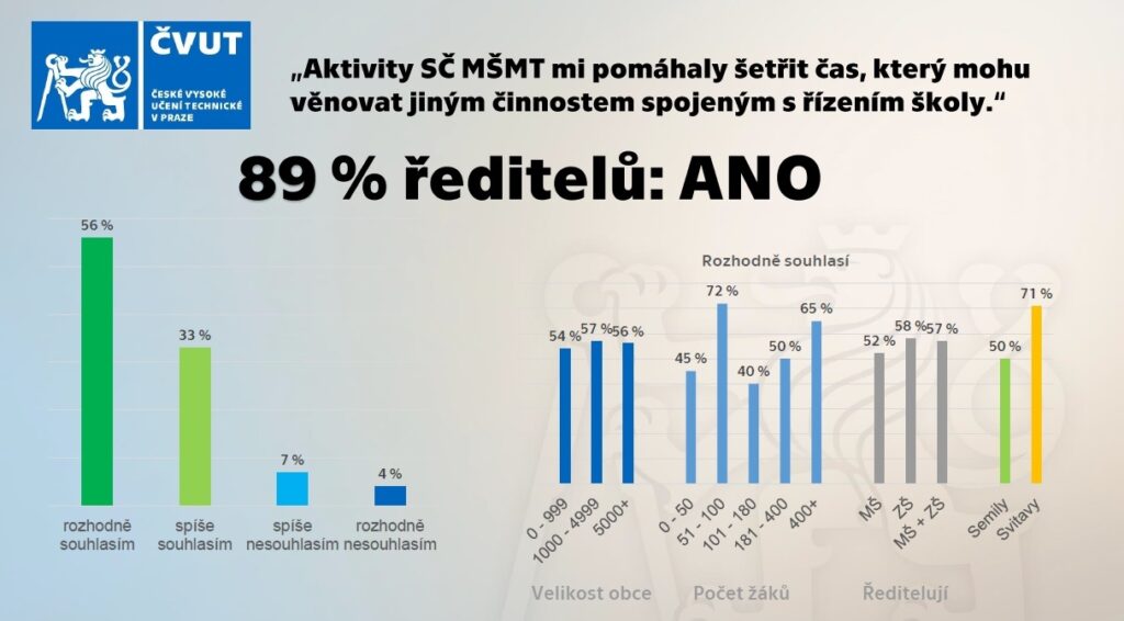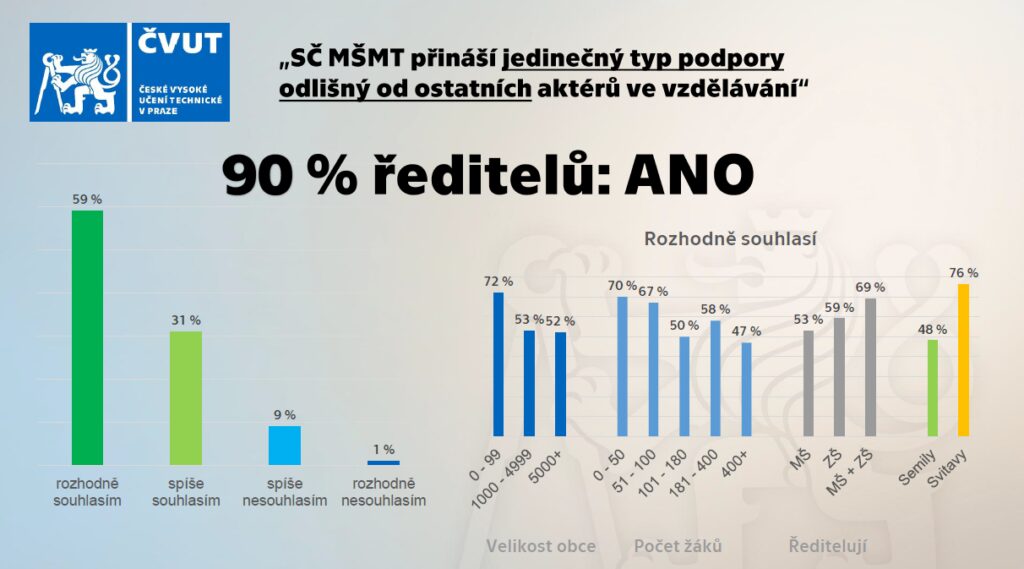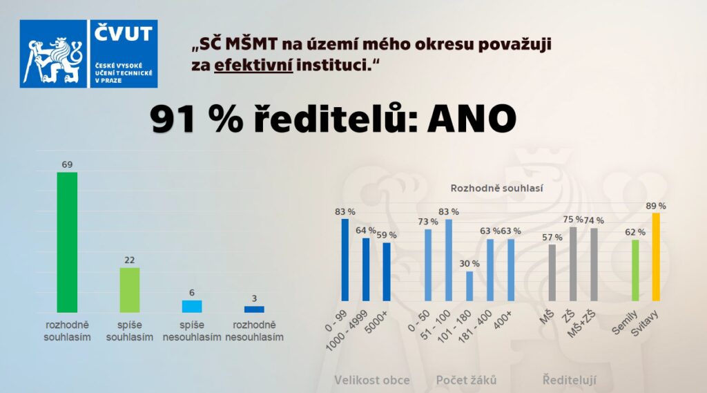 Celkový přínos středního článku MŠMT hodnotí ředitelé MŠ a ZŠ průměrnou školní známkou: 1,2 (Svitavsko) a 1,79 (Semilsko). 68 % ředitelů udělilo známku 1. Rozhodně pozitivně a spíše pozitivně hodnotí střední článek 71 % zřizovatelů.