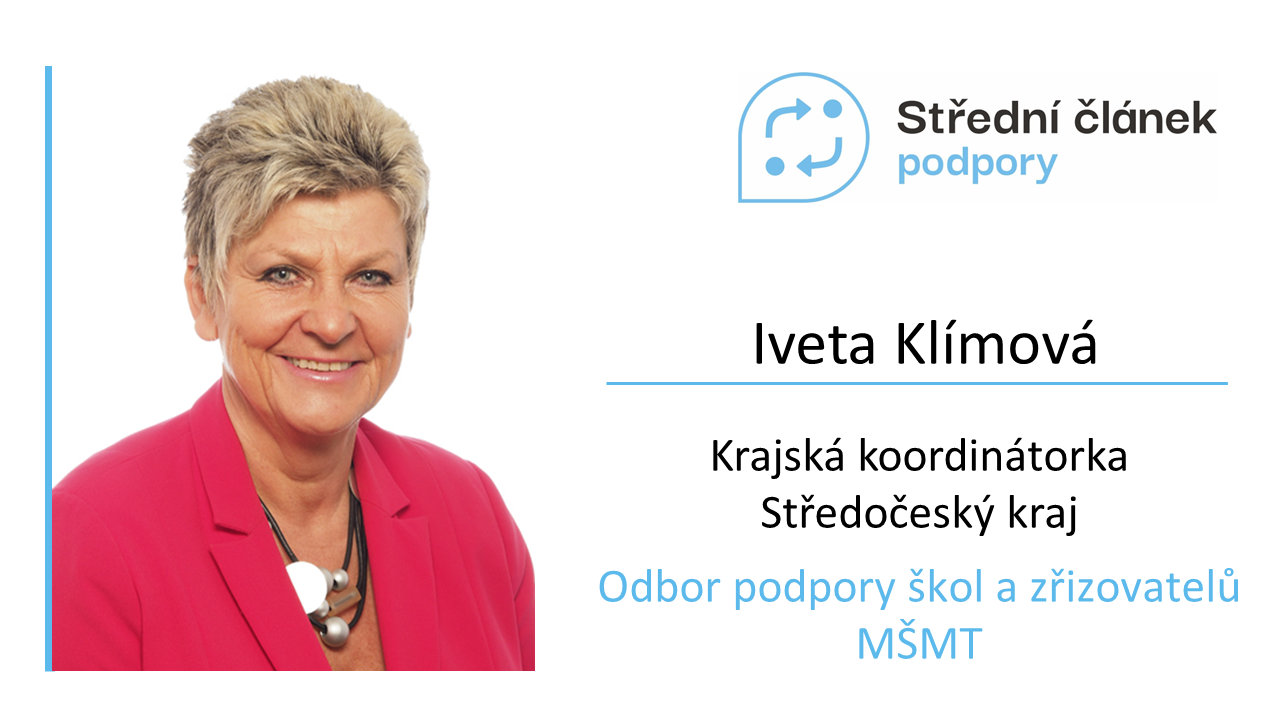 Střední článek podpory působí už také v největším kraji České republiky. Krajskou koordinátorkou a první členkou týmu ve Středočeském kraji se stala v polovině března 2024 Iveta Klímová. Přináší s sebou velké profesní zkušenosti, odhodlání, nadšení i elán přijímat nové výzvy. Ráda pracuje s lidmi, baví ji organizování aktivit, sdílení zkušeností, společné zlepšování, vytváření a posouvání věcí dál. Čeká ji vybudování sehraného týmu a podpora místních škol a zřizovatelů může začít.