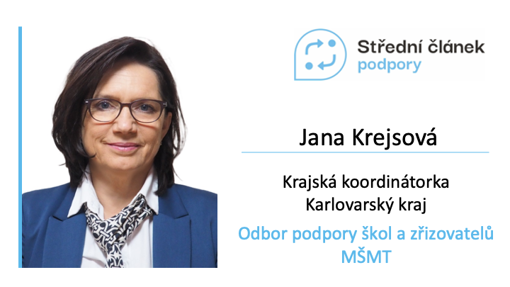 Jana Krejsová ve Středním článku podpory není žádný nováček. Působí v jeho řadách už rok. Když se k pilotáži středního článku ve svitavském a semilském okresu přidal také Karlovarský kraj díky Memorandu o spolupráci, byla součástí jeho týmu jako regionální metodička. Dnes je krajskou koordinátorkou. Na nové pozici zúročí nejenom bohaté zkušenosti získané za katedrou, z vedení projektů a veřejné správy, ale i z pilotu samotného.