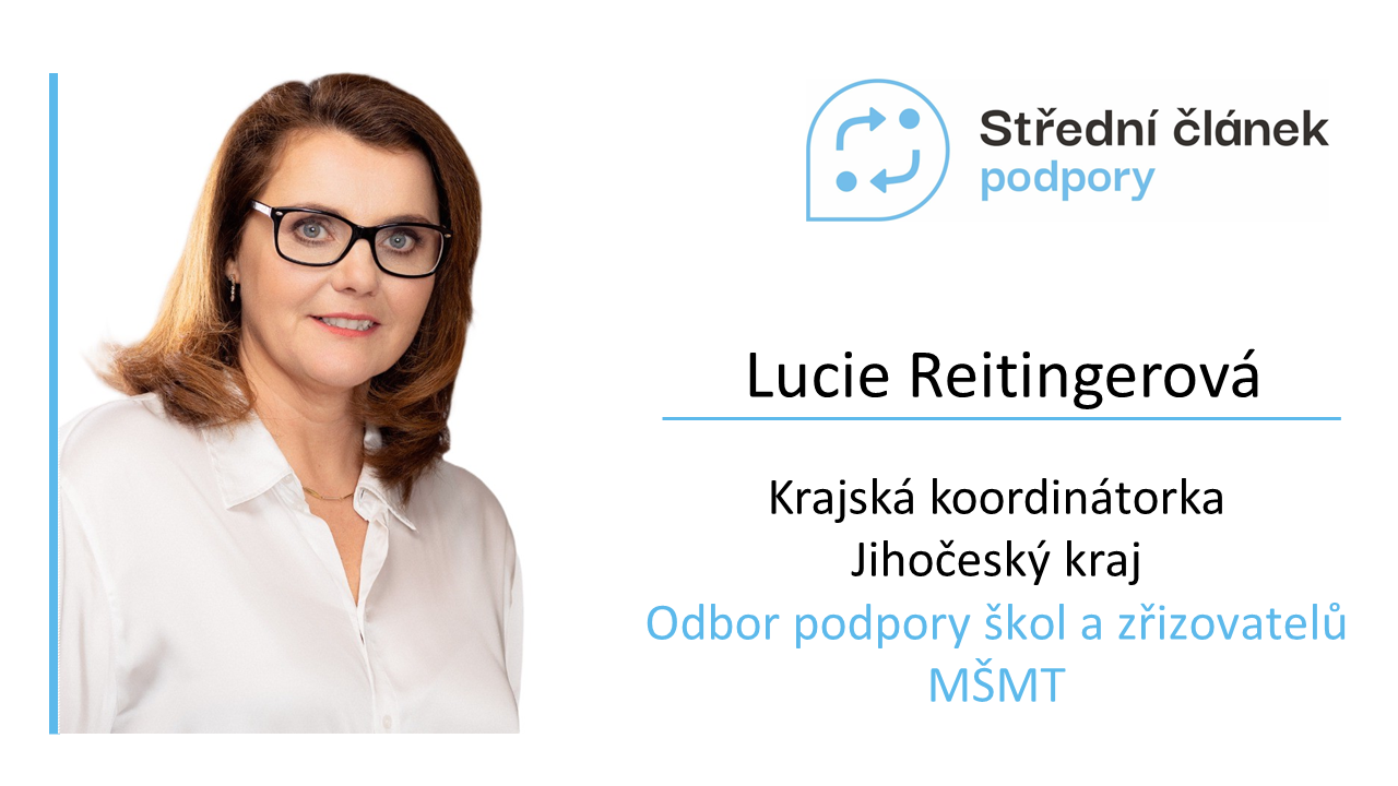 Střední článek podpory už působí také v Jihočeském kraji. V polovině února 2024 se zdejší krajskou koordinátorkou stala Lucie Reitingerová. Přináší s sebou dlouholeté zkušenosti získané v Odboru školství, mládeže a tělovýchovy Krajského úřadu Jihočeského kraje a podstatné jsou také její znalosti a praxe ve vzdělávacích projektech z evropských dotací. První členku týmu teď čeká především vybudování týmu regionálních metodiků, se kterými bude poskytovat podporu škol a jejich zřizovatelů v daném kraji.