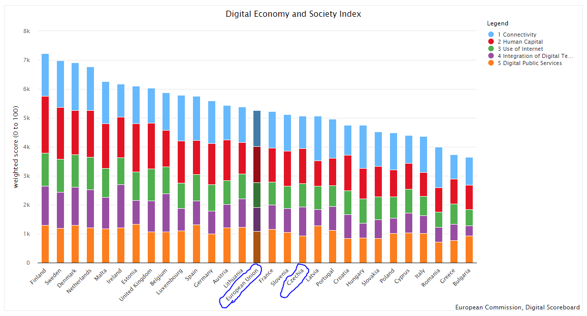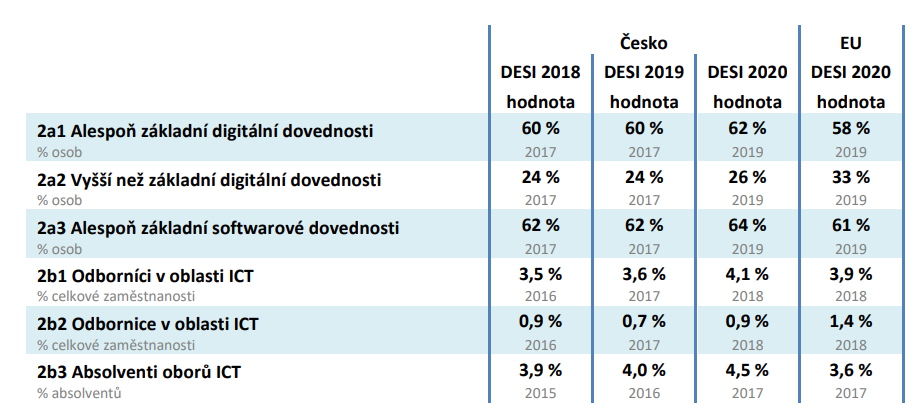 Česká republika se v roce 2020 umístila na 17. místě mezi 27 členskými státy EU v rámci indexu digitální ekonomiky a společnosti (DESI). Rozměr DESI, ve kterém si Česko vede nejlépe, je lidský kapitál. Podíl českých občanů s alespoň základními digitálními dovednostmi je nad průměrem EU a čtvrtina českých podniků nabízí ICT vzdělávání. ČR zůstává lídrem v oblasti elektronického obchodování s rostoucím podílem malých a středních podniků prodávajících online.