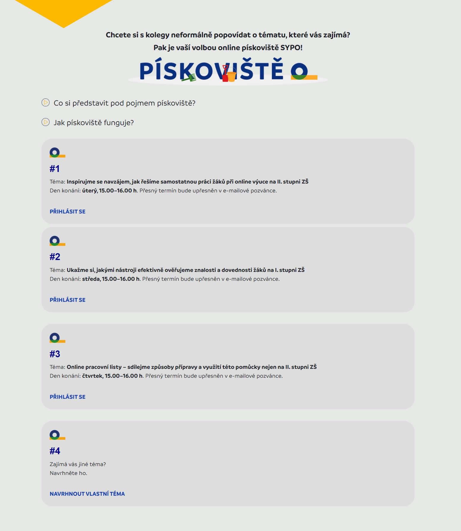 Projekt SYPO podporuje učitele při distanční výuce již téměř rok prostřednictvím webinářů přinášejících tipy, konkrétní nástroje a aplikace. „Pískoviště na úspěch webinářů přímo navazuje a naši podporu ještě rozšiřuje – od přijímání informací k jejich praktickému a aktivnímu používání,“ říká Jiří Nekola, hlavní projektový manažer SYPO, a dodává: „Na našem online Pískovišti účastníci