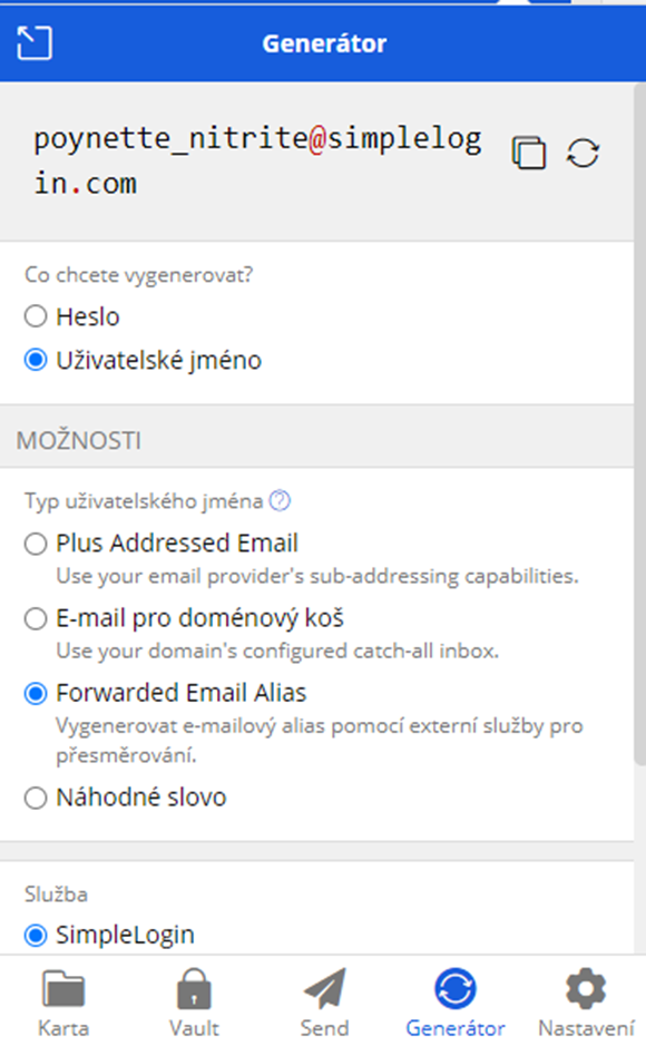 SimpleLogin se spojil s ProtonMailem a jde nastavit jako generátor adres ve správci hesel Bitwarden. Má také doplněk do webového prohlížeče, naleznete jej zde: SimpleLogin:Receive & Send emails anonymously – Internetový obchod Chrome (google.com)