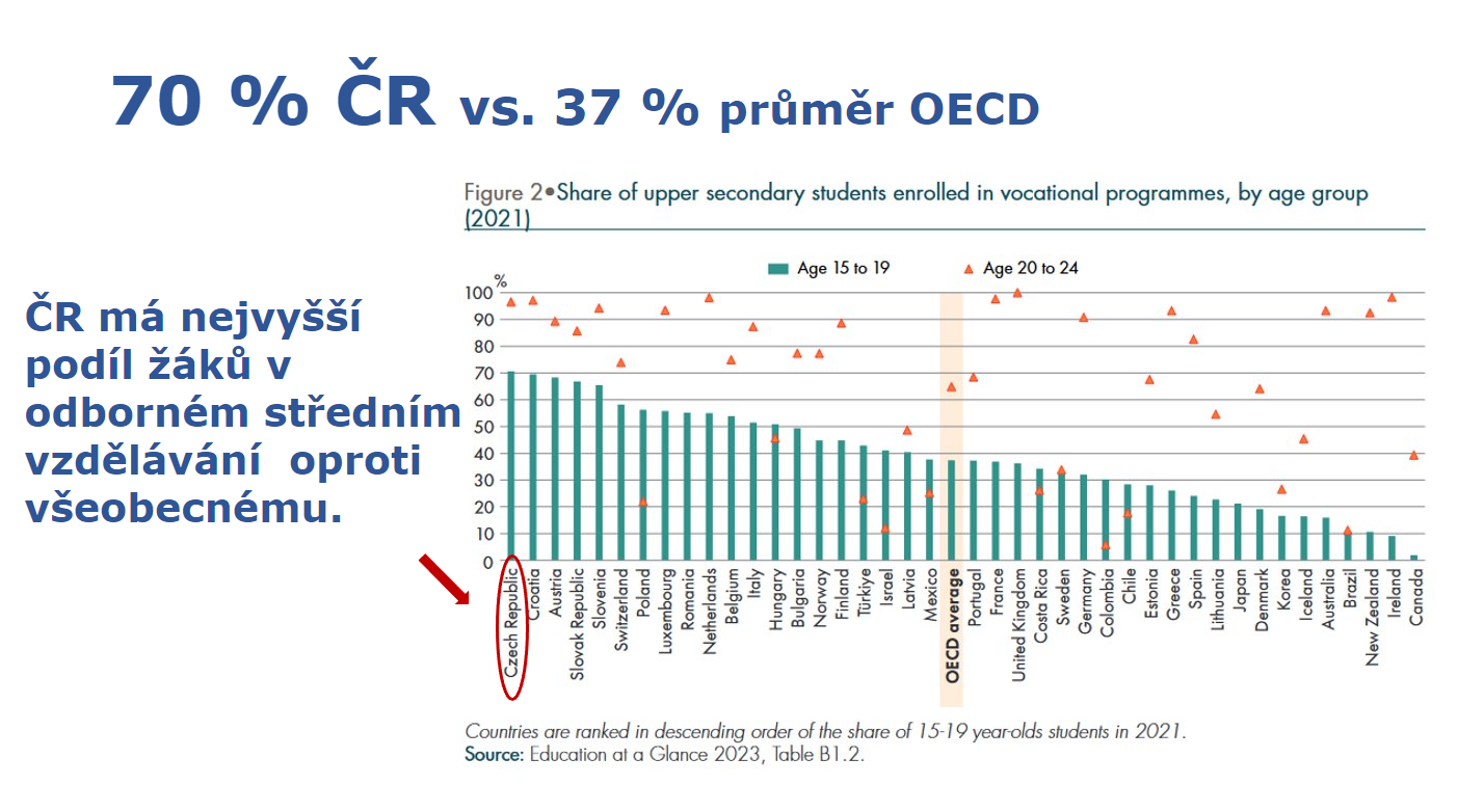 na střední školu a přibližně 7 % žáků na střední školu nastoupí, ale nedokončí ji, dalších zhruba 22 % žáků střední školu sice dokončí, ale po jejím absolvování nejsou spokojeni s volbou oboru. Dále připomněli, že v České republice tvoří až 70 % středního vzdělávání střední odborné školy, avšak průměr OECD je 37 %.