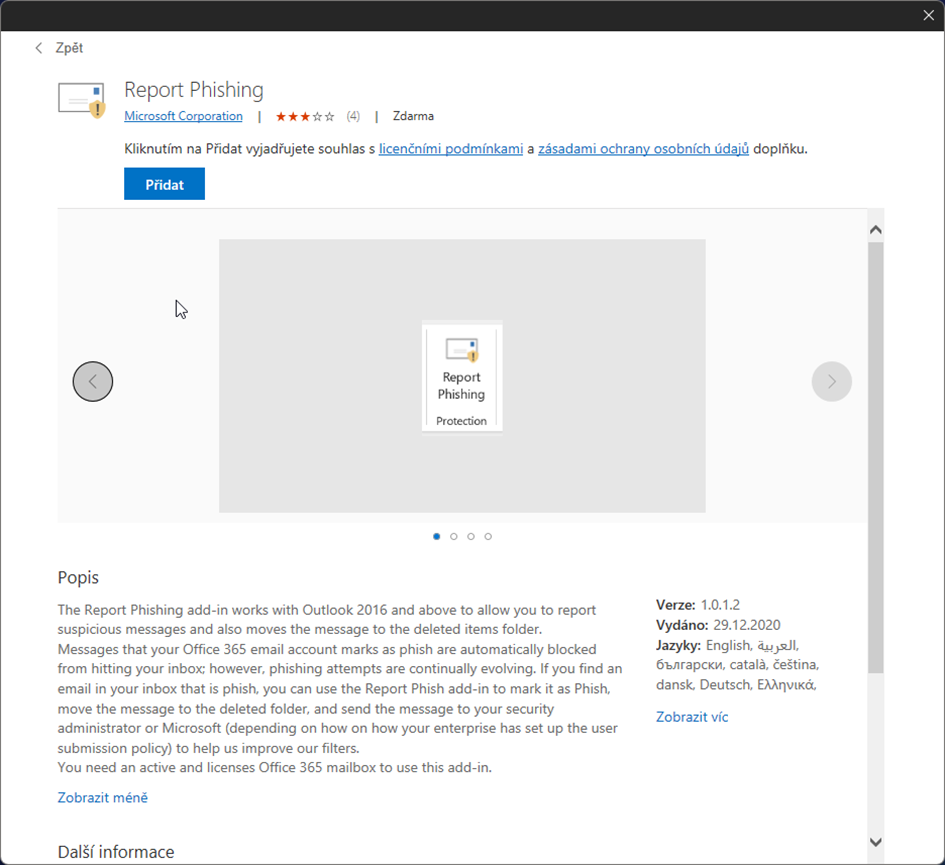 Přidání doplňku provedete vyhledáním „report phishing“.