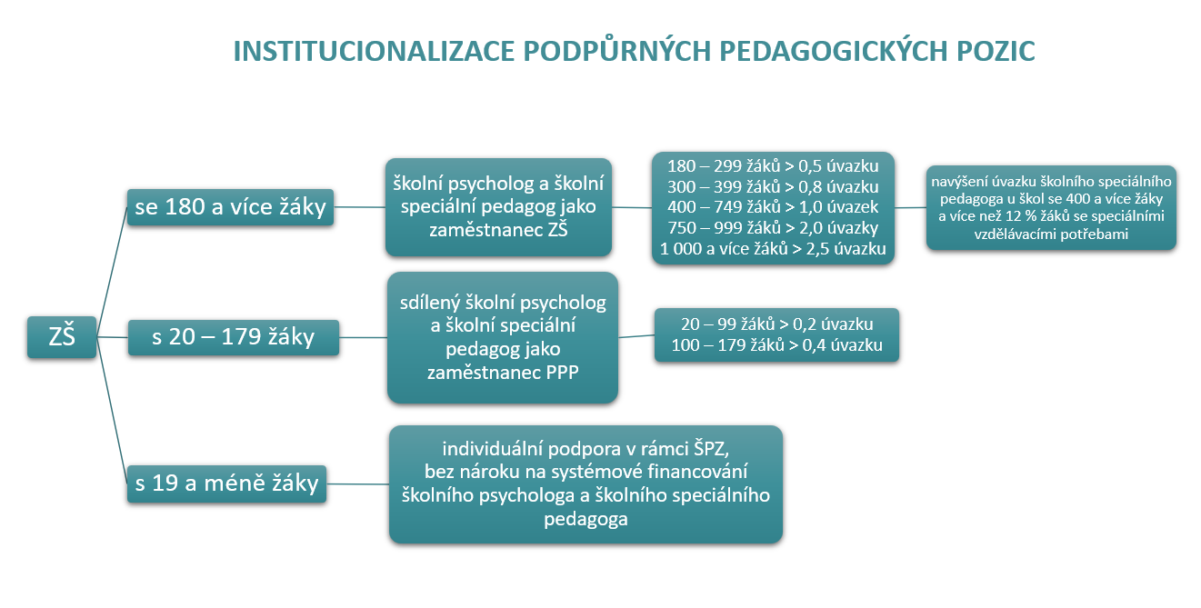 - Od začátku zavedení inkluzívního systému vzdělávání v České republice (r. 2016) existují paralelně dva způsoby financování podpůrných pedagogických pozic na školách – národní v rámci poskytování podpůrných opatření druhého až pátého stupně ze státního rozpočtu a z ESF prostřednictvím OP VVV.