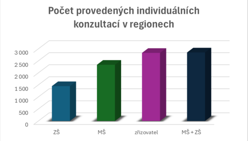 Tato data potvrzují vyvážené rozdělení podpory mezi školy a jejich zřizovatele, přičemž největší objem směřuje přímo do škol. Celkově se podařilo poskytnout téměř 9 500 individuálních konzultací v regionech, což představuje v průměru více než 3 konzultace denně od začátku projektu.