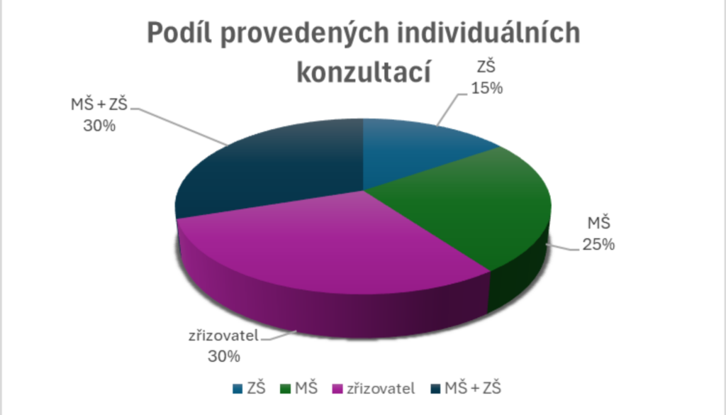 Významnou část činnosti tvořilo 9 462 individuálních konzultací uskutečněných v regionech, a to jak prezenčně, tak online. Tyto konzultace představují téměř polovinu veškeré podpory a jsou klíčové pro přizpůsobení pomoci specifickým potřebám jednotlivých škol a obcí. Doplnilo je 475 skupinových konzultací s celkovou účastí 7 652 osob, které se zaměřovaly především na sdílení zkušeností a řešení společných témat. K tomu se přidalo 50 setkání platforem spolupráce, jež propojily školy a zřizovatele v rámci širšího profesního dialogu, a 20 vydání Infoservisu, který pravidelně přináší aktuální a praktické informace vedení škol.