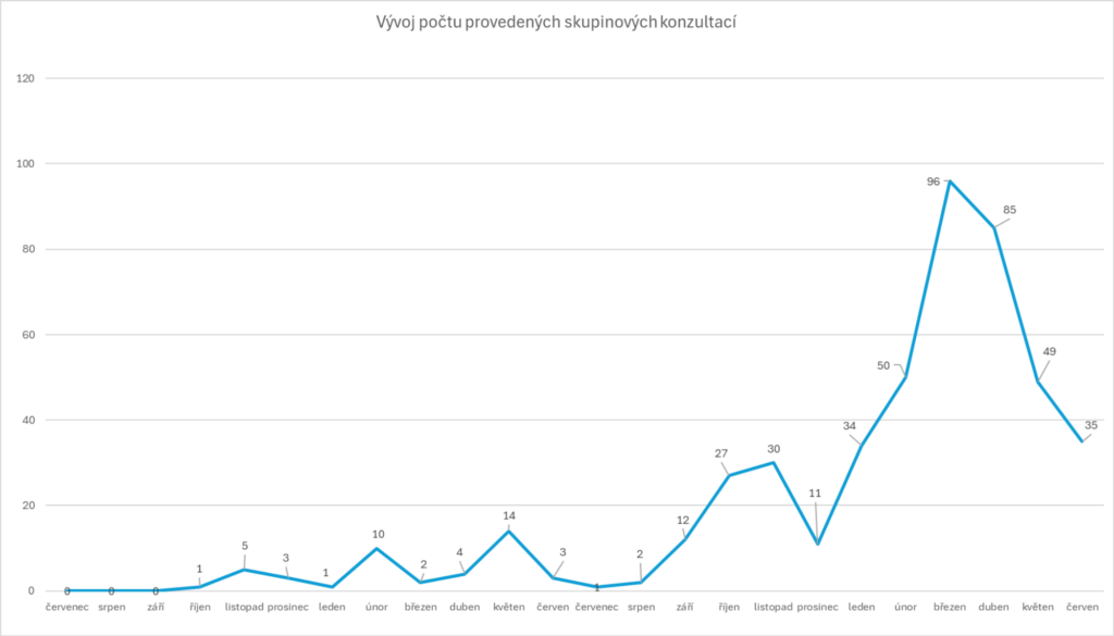 Podobně i počet skupinových konzultací v průběhu sledovaného období postupně rostl. Tyto akce se staly důležitou platformou pro sdílení zkušeností a řešení společných témat mezi školami a zřizovateli.