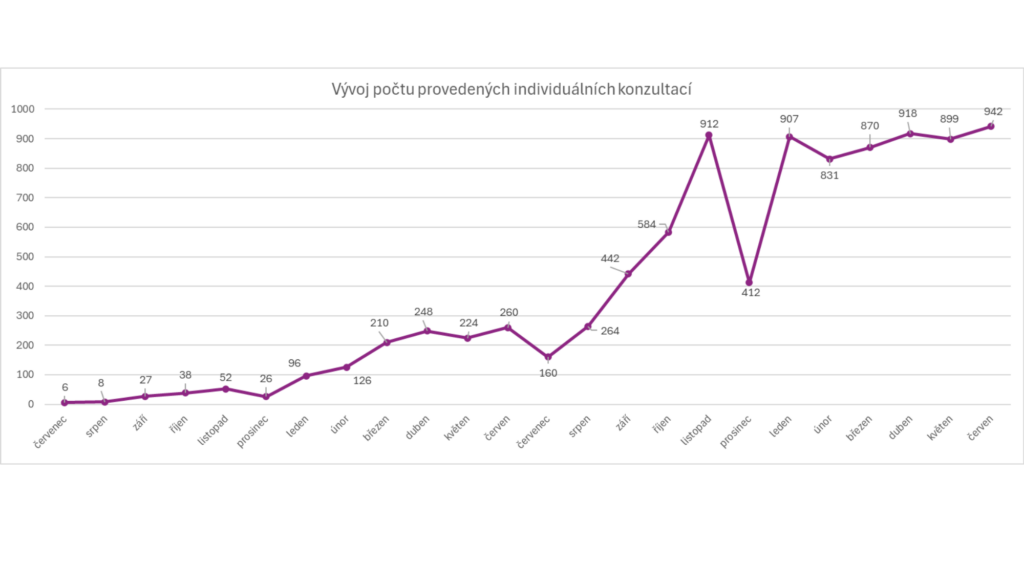 Graf vývoje počtu individuálních konzultací ukazuje trvalý růst, s výrazným nárůstem v posledních dvou sledovaných obdobích – mezi prvním a posledním obdobím došlo k nárůstu o více než 60 %, s průměrnou účastí 16 osob na jednu akci, do nichž se zapojilo přes 7 600 účastníků.