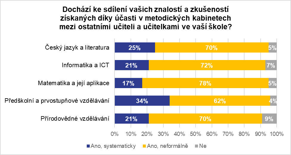 Přibližně 94 % respondentů uvedlo, že informace z metodických kabinetů předává kolegům nebo vedení školy. Systematicky dochází k přenosu informací nejčastěji u respondentů z kabinetů Předškolní a prvostupňové vzdělávání (34 %) a Český jazyk a literatura (25 %). Mezi nejběžnější způsoby patří podle respondentů sdílení informací v rámci běžné komunikace s kolegy a předávání materiálů podpory jako jsou metodické příručky nebo informace o webinářích. Přibližně polovina učitelů matematiky a českého jazyka informuje o dění v metodických kabinetech také v rámci školního předmětového sdružení.