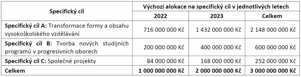 Alokace na výzvu činí 3 000 000 000 Kč. Výchozí alokace na výzvu je rozdělena do tří specifických cílů dle tabulky uvedené níže. Popis specifických cílů je uveden v části 7 této výzvy.