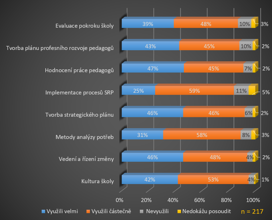 Zajímavé byly i závěry interní evaluace, které představil Adam Spálenský (týmový manažer této klíčové aktivity) a externí evaluátoři projektu Lucie Bučinová a Vladimír Sodomka. Z jejich příspěvků vyberme např. ukazatel, jak školy, zapojené do intenzivní podpory projektu SRP, využily naučené nástroje a poznatky v praxi.
