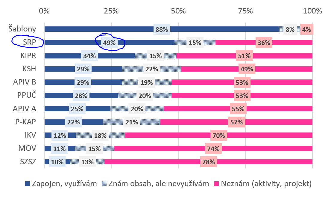 Zajímavé byly i závěry interní evaluace, které představil Adam Spálenský (týmový manažer této klíčové aktivity) a externí evaluátoři projektu Lucie Bučinová a Vladimír Sodomka. Z jejich příspěvků vyberme např. ukazatel, jak školy, zapojené do intenzivní podpory projektu SRP, využily naučené nástroje a poznatky v praxi.